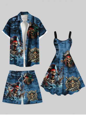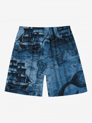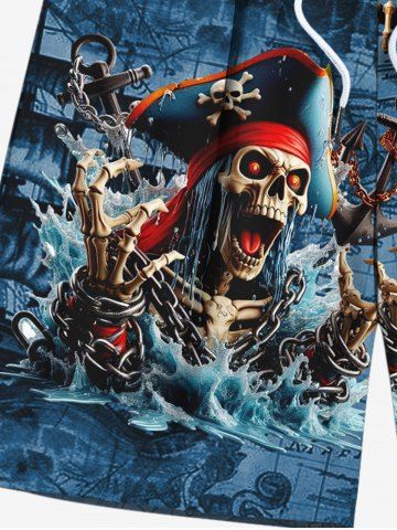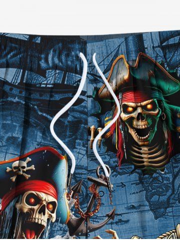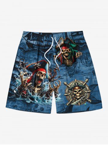 Plus Size Skull Skeleton Pirate Sea Waves Print Hawaii Cruise Drawstring Beach Shorts For Men - Deep Blue - 8xl