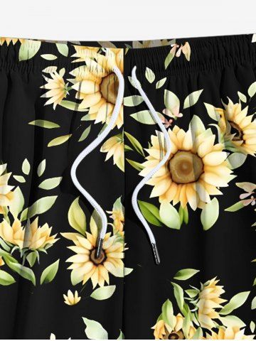 Plus Size Sunflower Leaf Print Hawaii Drawstring Pocket Beach Shorts For Men - Black - 6xl
