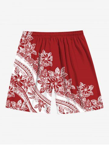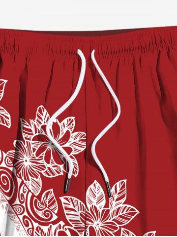 Plus Size Tropical Leaf Hibiscus Flower Ethnic Print Hawaii Drawstring Beach Shorts For Men - Red - 5xl