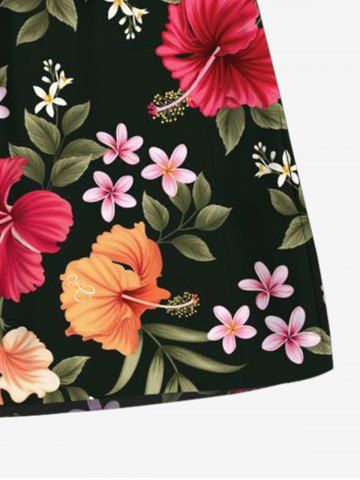 Plus Size Tropical Leaf Hibiscus Flower Print Hawaii Drawstring Pocket Beach Shorts For Men - Black - M
