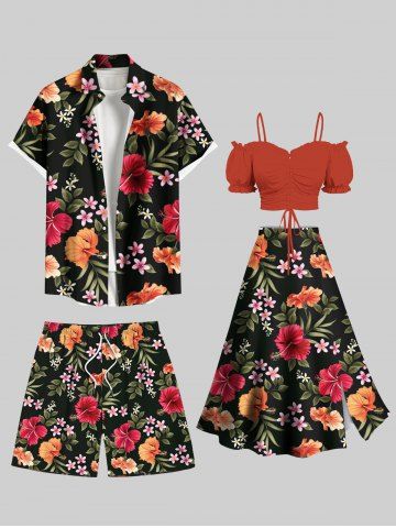 Plus Size Tropical Leaf Hibiscus Flower Print Hawaii Drawstring Pocket Beach Shorts For Men - Black - L