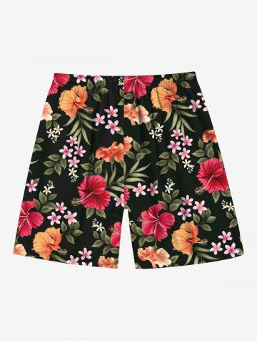 Plus Size Tropical Leaf Hibiscus Flower Print Hawaii Drawstring Pocket Beach Shorts For Men - Black - 5xl