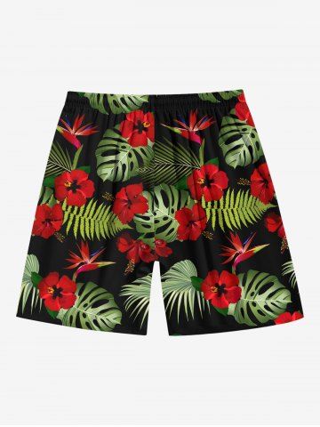 Shorts > Plus Size Tropical Leaf Hibiscus Flower Print Hawaii Drawstring Pocket Beach Shorts For Men