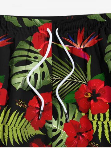 Plus Size Tropical Leaf Hibiscus Flower Print Hawaii Drawstring Pocket Beach Shorts For Men - Black - 6xl