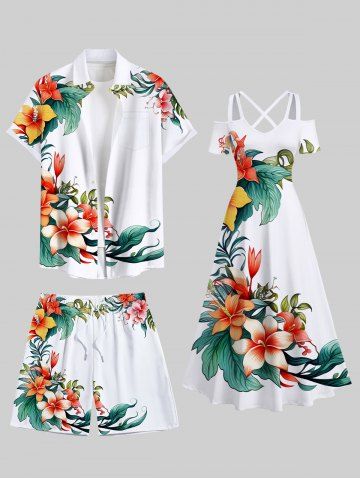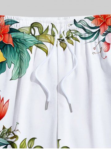 Plus Size Tropical Leaf Flower Print Hawaii Drawstring Beach Shorts For Men - White - 3xl