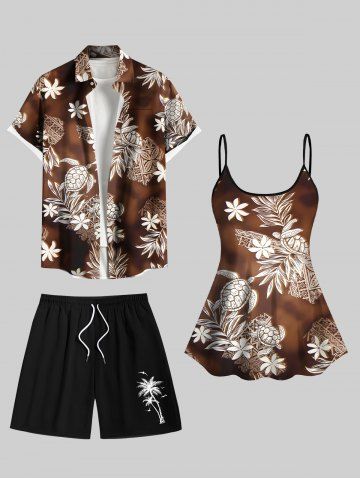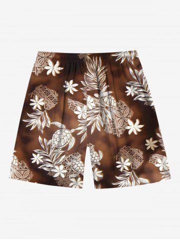 Plus Size Tropical Leaf Turtle Ethnic Tie Dye Ombre Print Hawaii Drawstring Beach Shorts For Men - Deep Coffee - 3xl