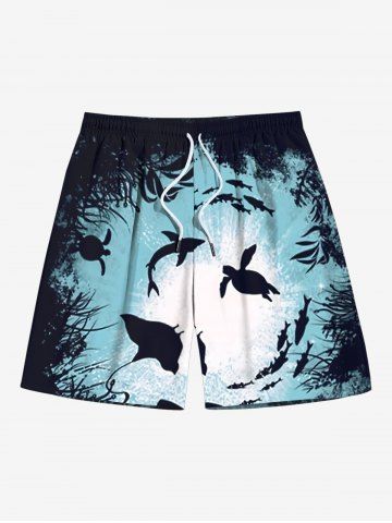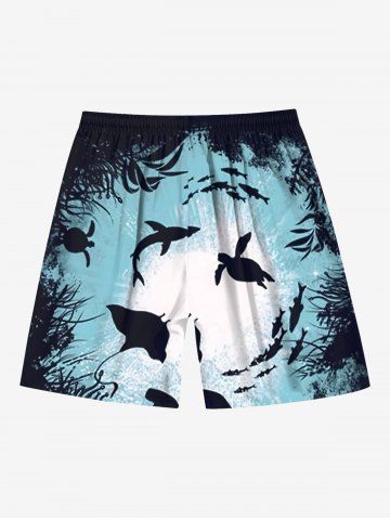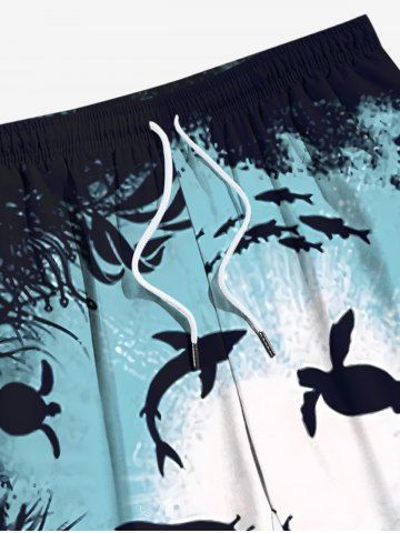 Plus Size Turtle Shark Seabed Print Hawaii Sea Creatures Drawstring Beach Shorts For Men - Light Blue - M