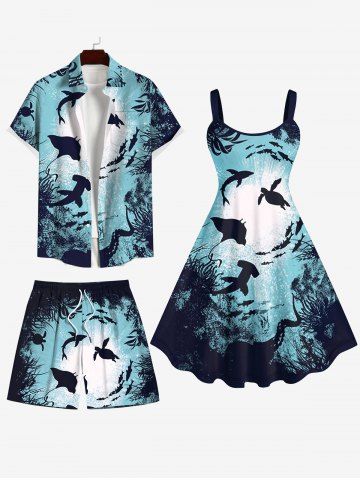 Shorts > Plus Size Turtle Shark Seabed Print Hawaii Sea Creatures Drawstring Beach Shorts For Men