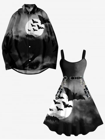 Men > Plus Size Bat Moon Ombre Midnight Print Halloween Button Shirt For Men
