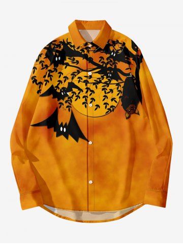 Plus Size Bat Tree Branch Moon Tie Dye Print Halloween Button Shirt For Men - Dark Orange - M