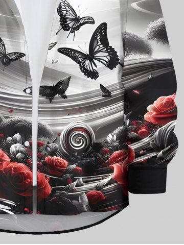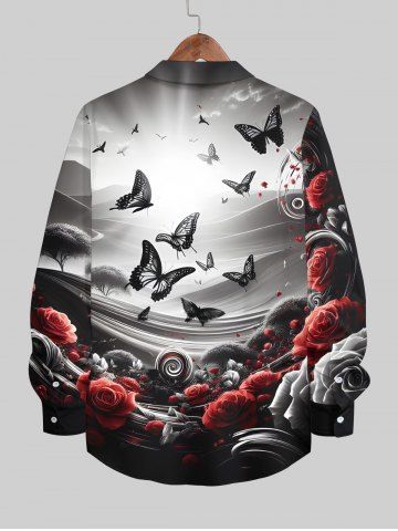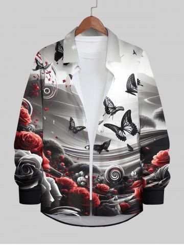 Plus Size Butterfly Rose Flower Ombre Light Beam Print Halloween Button Shirt For Men - Black - 8xl