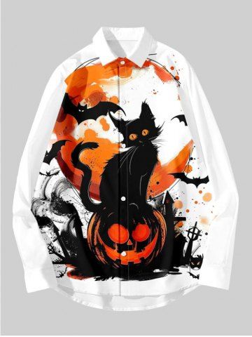 Men > Plus Size Cat Pumpkin Bat Cross Ink Painting Splatter Print Halloween Button Shirt For Men