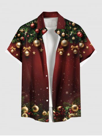 Plus Size Christmas Ball Bowknot Star Tassel Holly Fruit Print Buttons Pocket Shirt For Men - Red - Xl