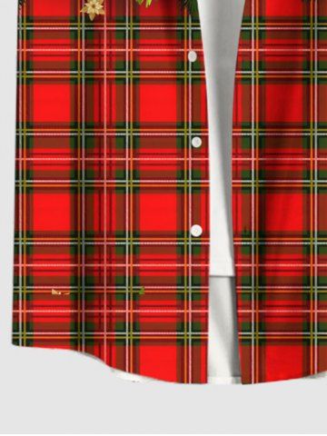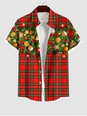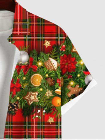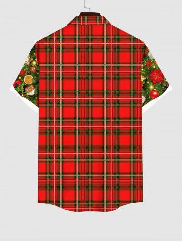 Plus Size Christmas Ball Star Bell Flowers Leaf Gingerbread Plaid Print Buttons Pocket Shirt For Men - Red - Xl