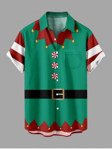 Plus Size Christmas Bells Candy Clown Costume Print Buttons Pocket Shirt For Men - Green - S