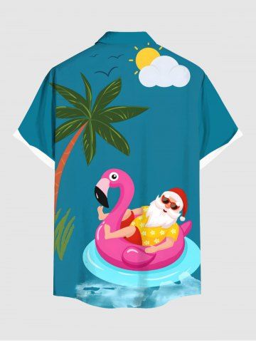 Plus Size Christmas Coconut Tree Santa Claus Swimming Ring Cloud Print Hawaii Button Pocket Shirt For Men - Peacock Blue - 4xl