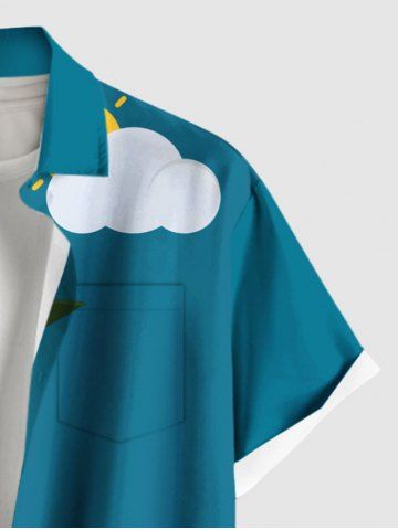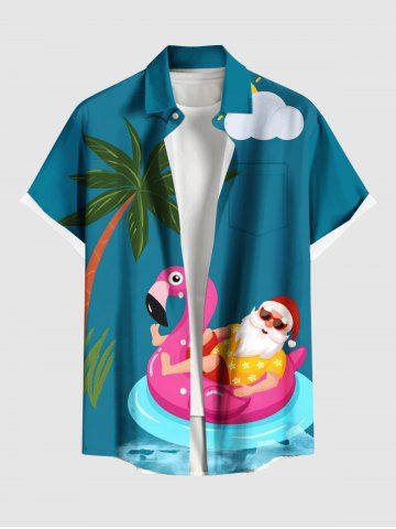 Plus Size Christmas Coconut Tree Santa Claus Swimming Ring Cloud Print Hawaii Button Pocket Shirt For Men - Peacock Blue - 5xl