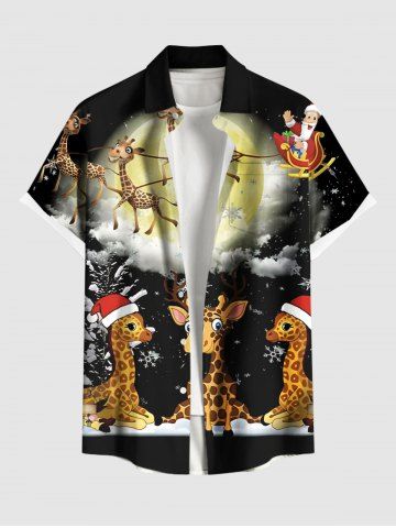 Plus Size Christmas Elk Santa Claus Snowflake Moon Giraffe Print Button Pocket Shirt For Men - Black - S