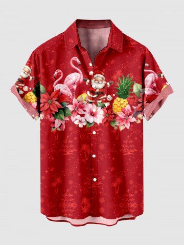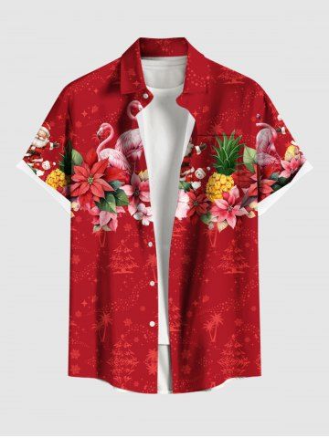 Plus Size Christmas Flamingo Santa Claus Pineapple Flowers Print Buttons Pocket Shirt For Men - Red - M