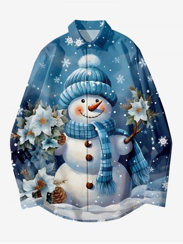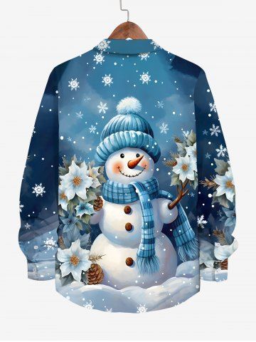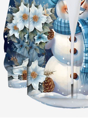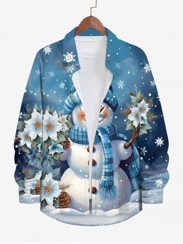 Plus Size Christmas Flowers Pine Nuts Snowman Snowflake Print Buttons Pocket Long Sleeve Shirt For Men - Blue - L