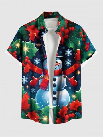 Plus Size Christmas Fruit Leaf Snowman Snowflake Print Buttons Pocket Shirt For Men - Green - 2xl