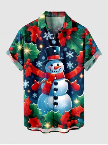 Plus Size Christmas Fruit Leaf Snowman Snowflake Print Buttons Pocket Shirt For Men - Green - 3xl