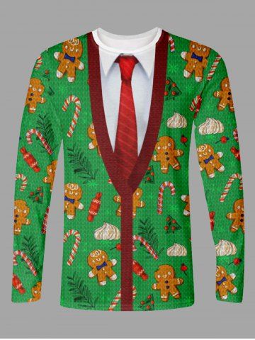 Plus Size Christmas Gingerbread Candy Print Long Sleeves T-shirt For Men - Green - 2xl