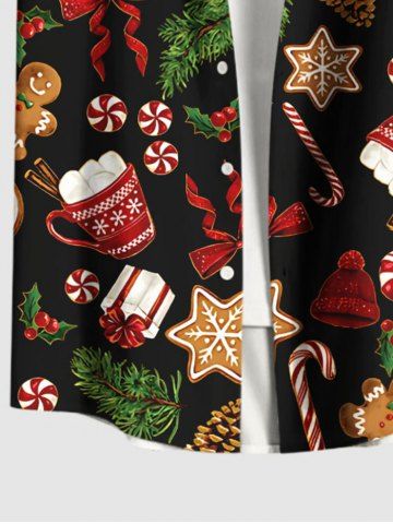 Plus Size Christmas Gingerbread Star Bowknot Candy Snowflake Print Buttons Pocket Shirt For Men - Black - 2xl