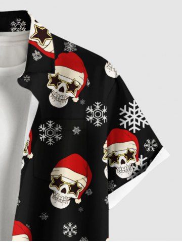 Plus Size Christmas Hat Snowflake Stars Skull Print Button Pocket Shirt For Men - Black - L