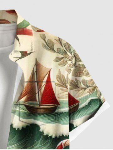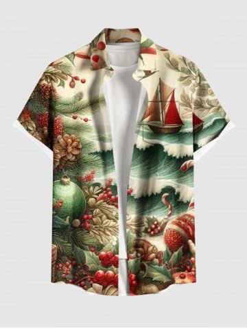Men's Clothing > Plus Size Christmas Holly Candy Sea Waves Sailboat Print Cruise Button Pocket Shirt For Men