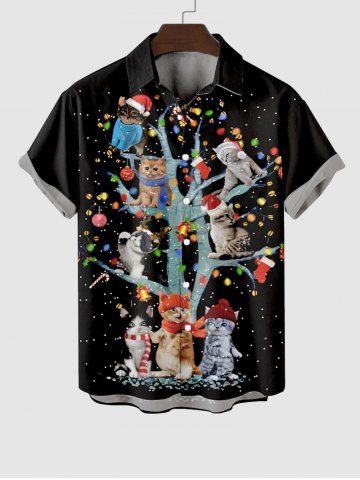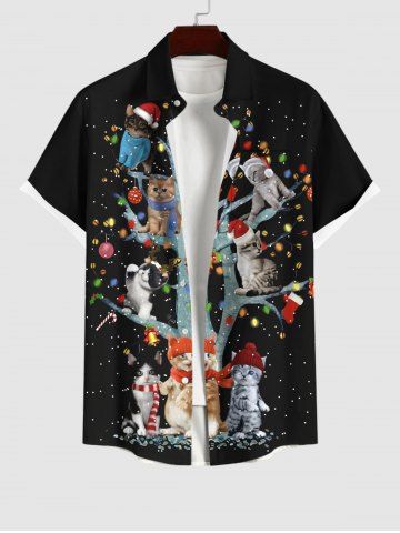 Plus Size Christmas Light Ball Tree Hat Cats Snowflake Bell Print Buttons Pocket Shirt For Men - Black - M