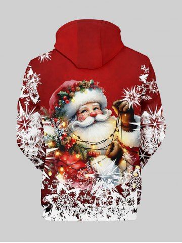 Plus Size Christmas Light Santa Claus Snowflake Print Pocket Drawstring Hoodie For Men - Red - L