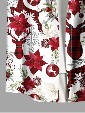 Plus Size Christmas Plaid Elk Flowers Snowflake Print Buttons Pocket Shirt For Men - Red - M