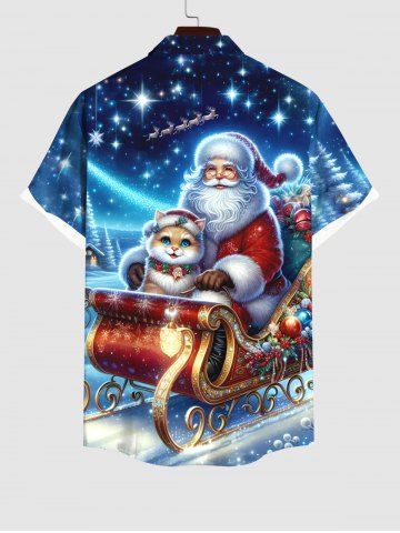 Plus Size Christmas Santa Claus Cat Sled Star Glitter 3D Print Buttons Pocket Shirt For Men - Blue - L