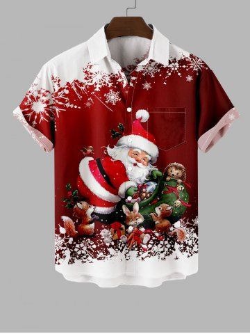 Plus Size Christmas Santa Claus Sacks Squirrel Snowflake Colorblock Print Buttons Pocket Shirt For Men - Red - M