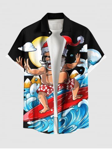 Plus Size Christmas Santa Claus Sun Cloud Sea Waves Print Buttons Pocket Shirt For Men - Black - Xl