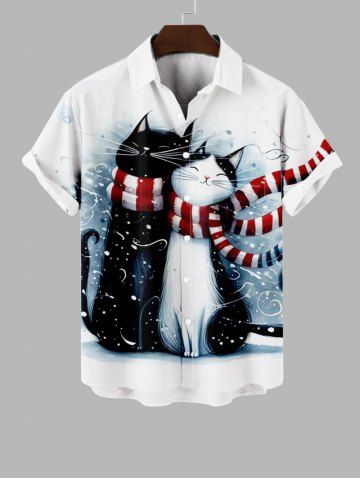 Men's Clothing > Plus Size Christmas Scarf Cat Lovers Print Button Pocket Shirt For Men