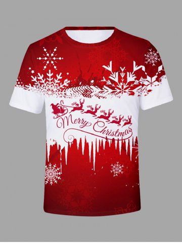 Plus Size Christmas Snowflake Elk Santa Claus Sled Colorblock Print T-shirt For Men - Red - 2xl