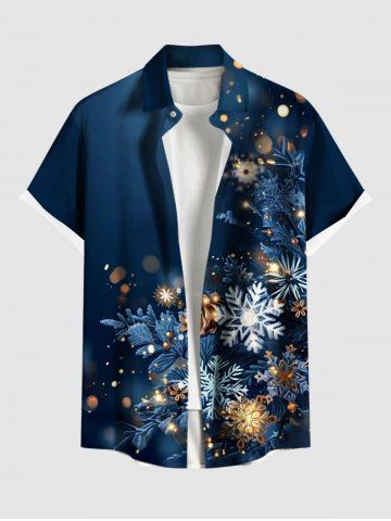 Plus Size Christmas Snowflake Leaf Glitter 3D Print Buttons Pocket Shirt For Men - Navy Blue - L