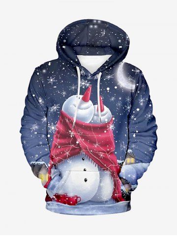 Plus Size Christmas Snowman Snowflake Cups Moon Print Pocket Drawstring Hoodie For Men - Multi-a - L