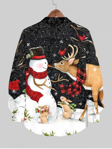 Plus Size Christmas Snowman Snowflake Elk Rabbit Bird Colorblock Print Buttons Long Sleeve Shirt For Men - Black - M