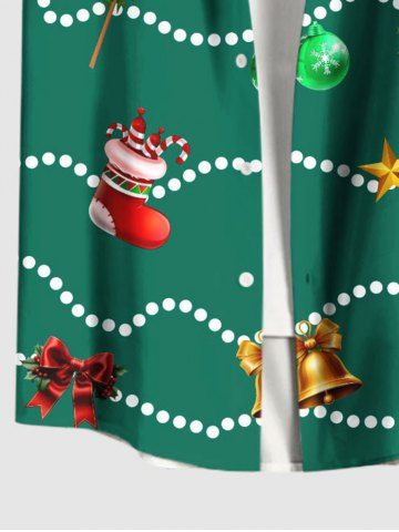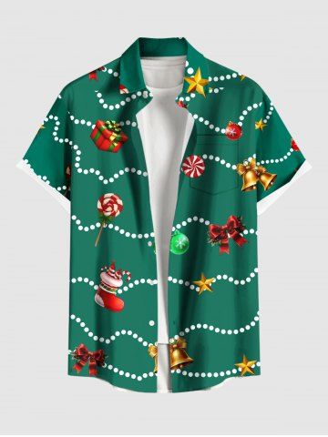 Plus Size Christmas Stocking Bell Candy Ball Bowknot Print Buttons Pocket Shirt For Men - Deep Green - 5xl