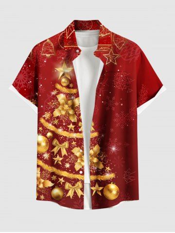 Plus Size Christmas Tree Bowknot Ball Bell Flowers Snowflake Print Buttons Pocket Shirt For Men - Red - L