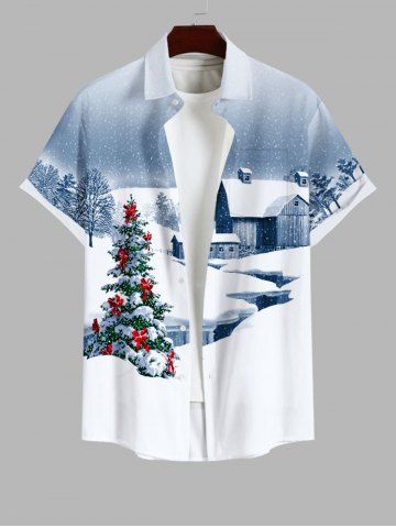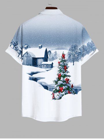 Plus Size Christmas Tree Bowknot Snowflake House Print Buttons Pocket Shirt For Men - White - 2xl
