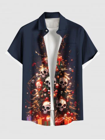 Plus Size Christmas Tree Skull Print Button Pocket Shirt For Men - Black - L