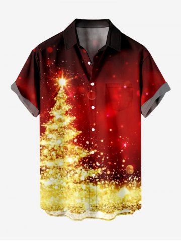 Plus Size Christmas Tree Star Ombre Sparkling Sequin Glitter 3D Print Buttons Pocket Shirt For Men - Red - L
