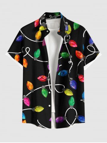 Plus Size Colorful Christmas Light Print Button Pocket Shirt For Men - Black - S