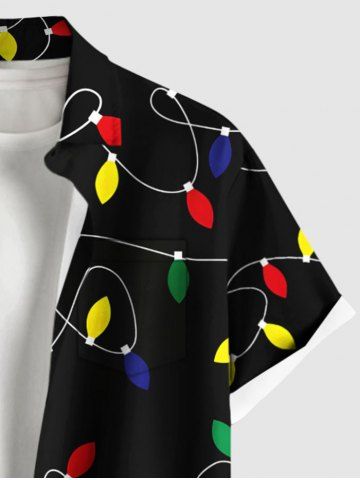 Plus Size Colorful Christmas Light Print Buttons Pocket Shirt For Men - Black - S
