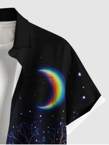 Plus Size Colorful Glitter Christmas Tree Cat Moon Galaxy Print Button Pocket Shirt For Men - Black - 3xl