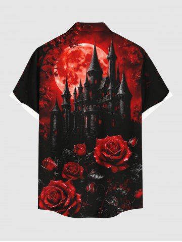 Plus Size Dark Style Rose Flower Castle Moon Print Halloween Button Pocket Shirt For Men - Red - M